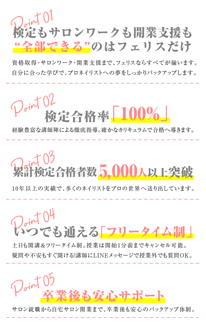 ネイリストになるには取得しておきたいジェルネイル検定。フェリスでは毎月開催しているので、都合の良いタイミングで受験できます。また、フェリスはJNA認定校のため初級は筆記試験のみ。いつもの教室で受験ができます。
