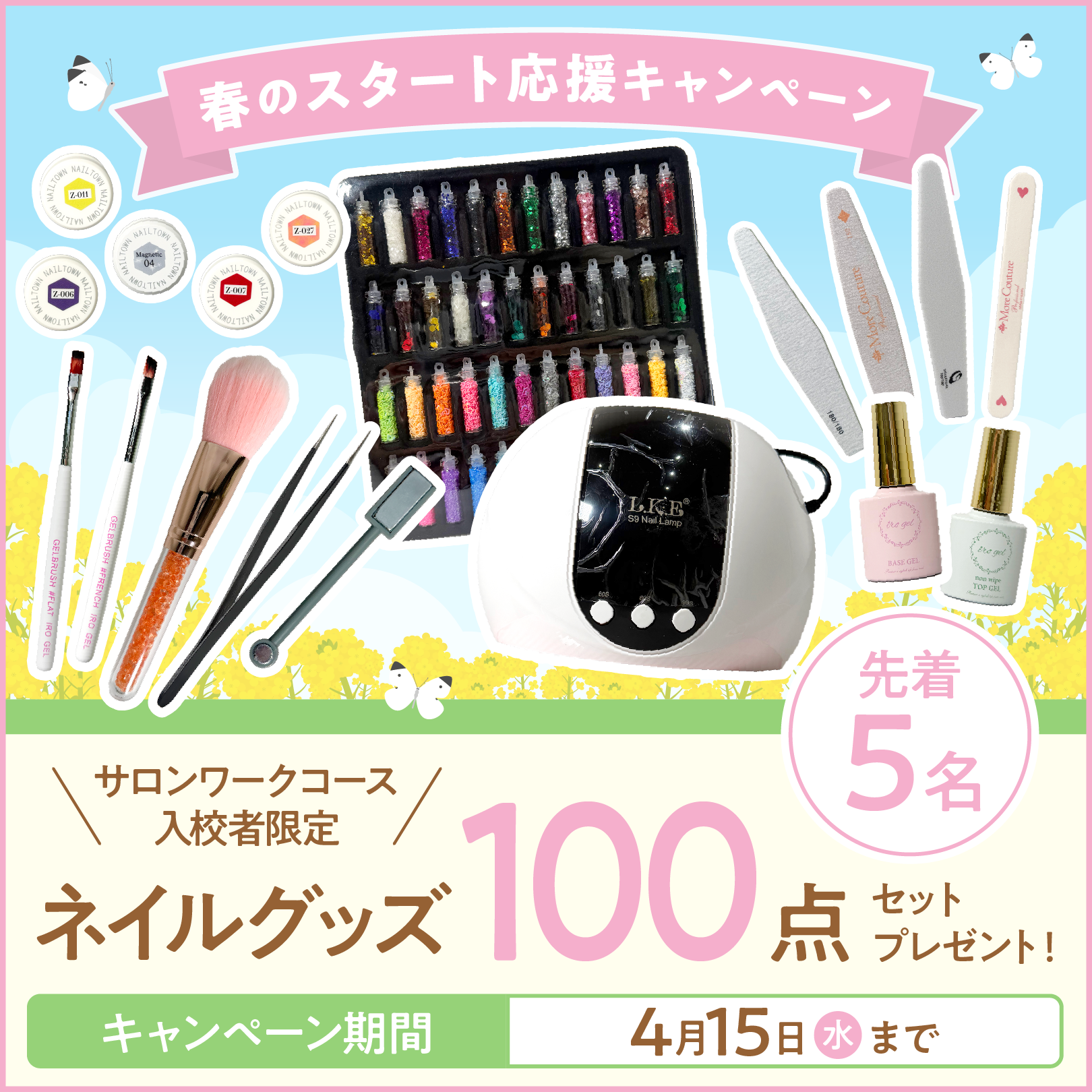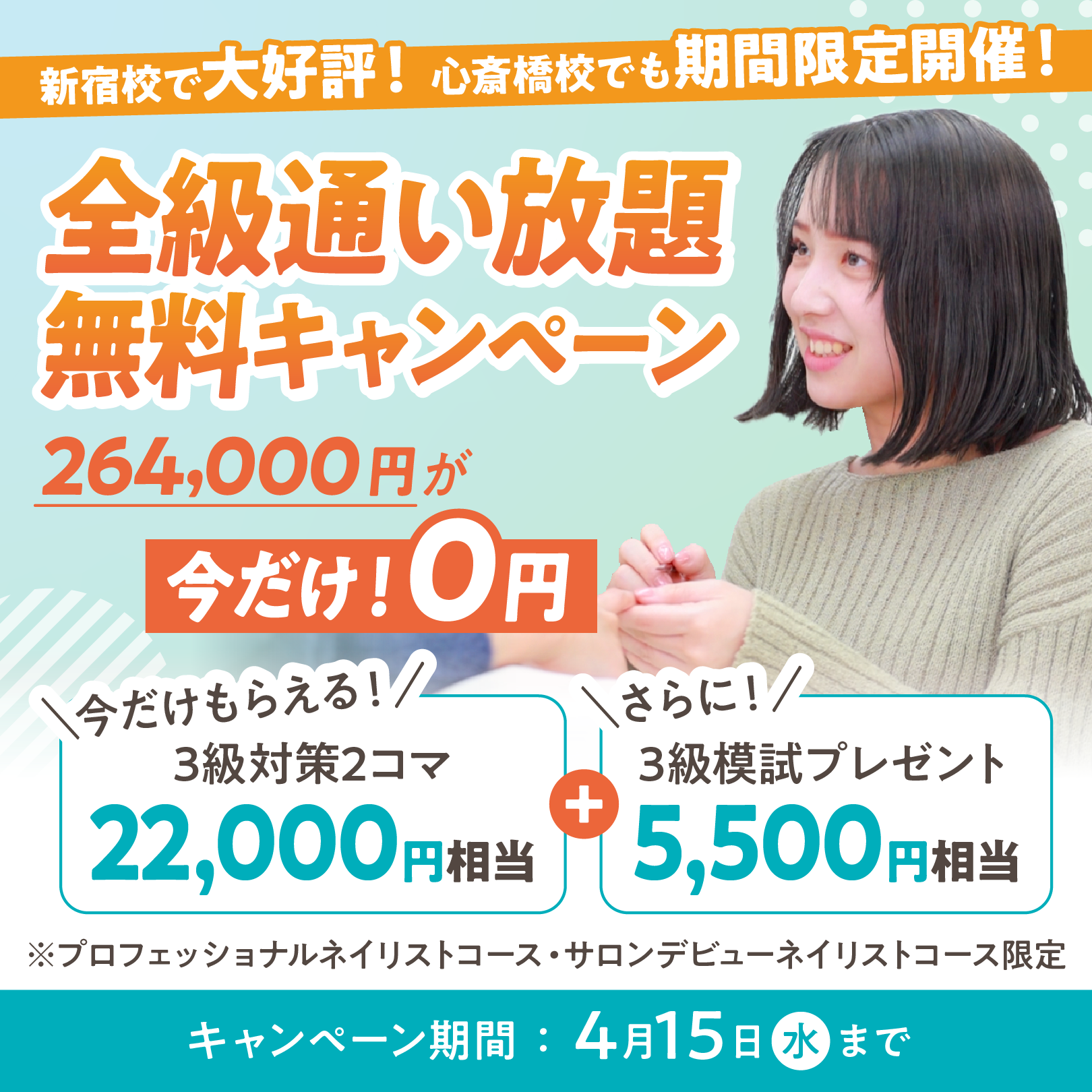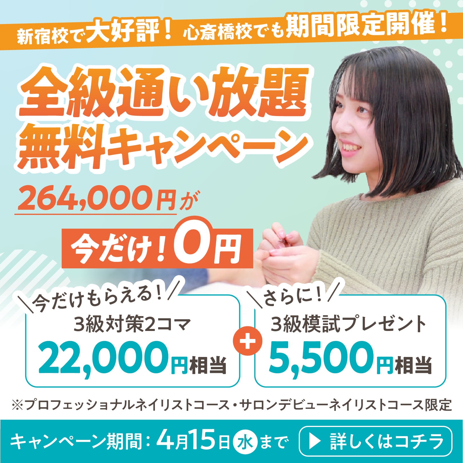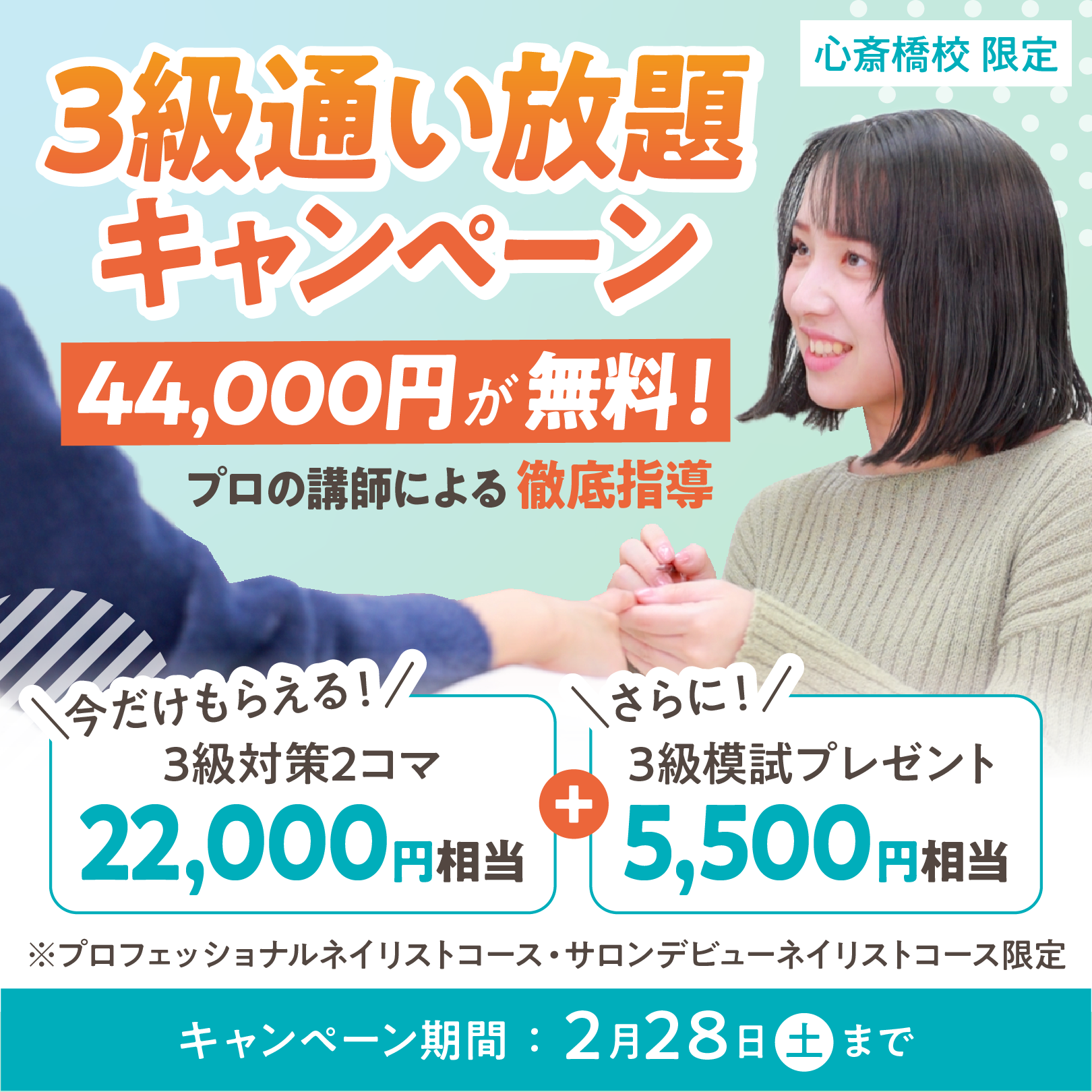 春のネイリスト技能検定3級に向けた、期間限定・特別価格のキャンペーンです。